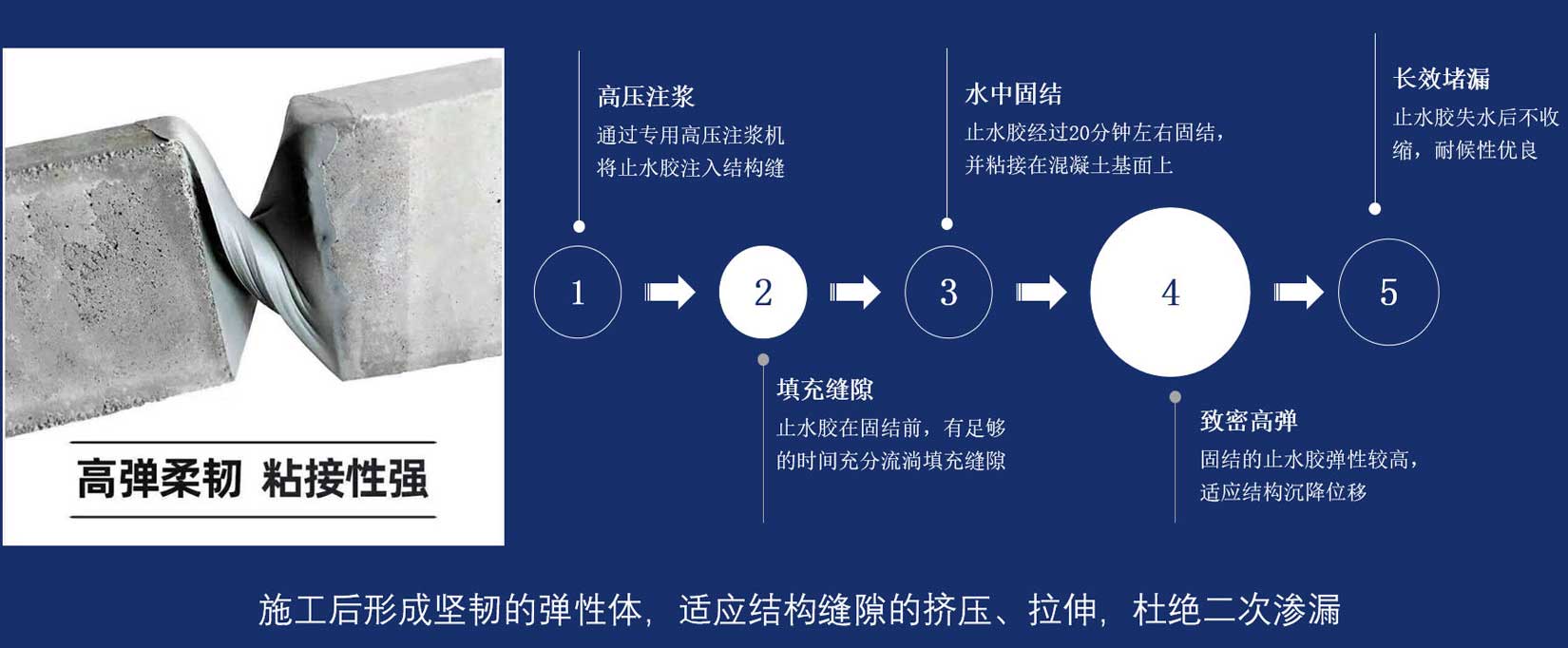 弹性注浆止水胶固结后致密耐水、不收缩、耐腐蚀、耐霉变、耐热、耐寒、不透水性强,具有弹性,能适应裂缝胀缩和结构变形,有效减少复漏并延长堵漏寿命。材料本身环保无毒可用于饮用水,是一种绝佳的先进可靠堵漏材料。