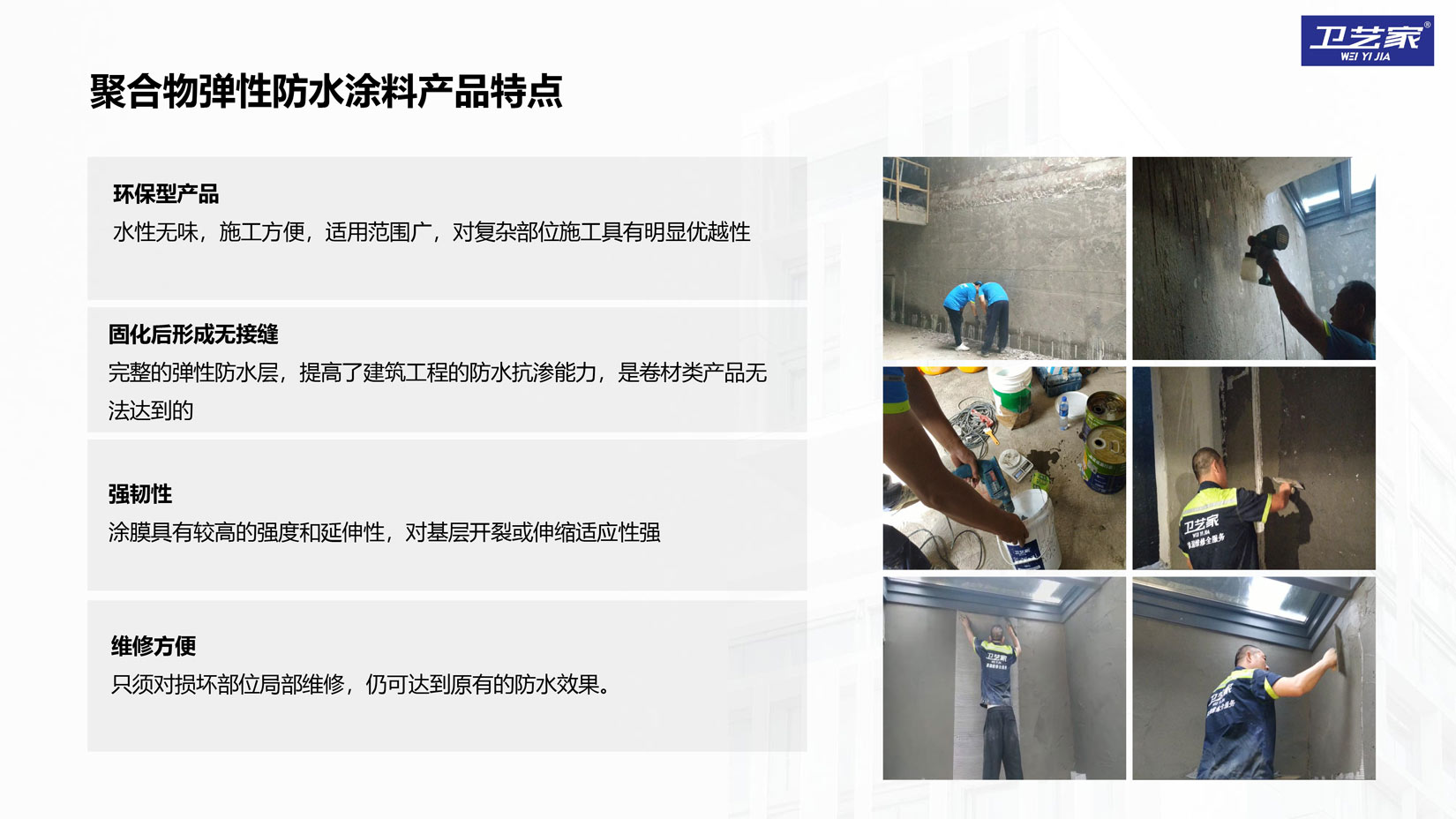1.环保型产品,水性无味,施工方便,适用范围广,对复杂部位施工具有明显优越性。